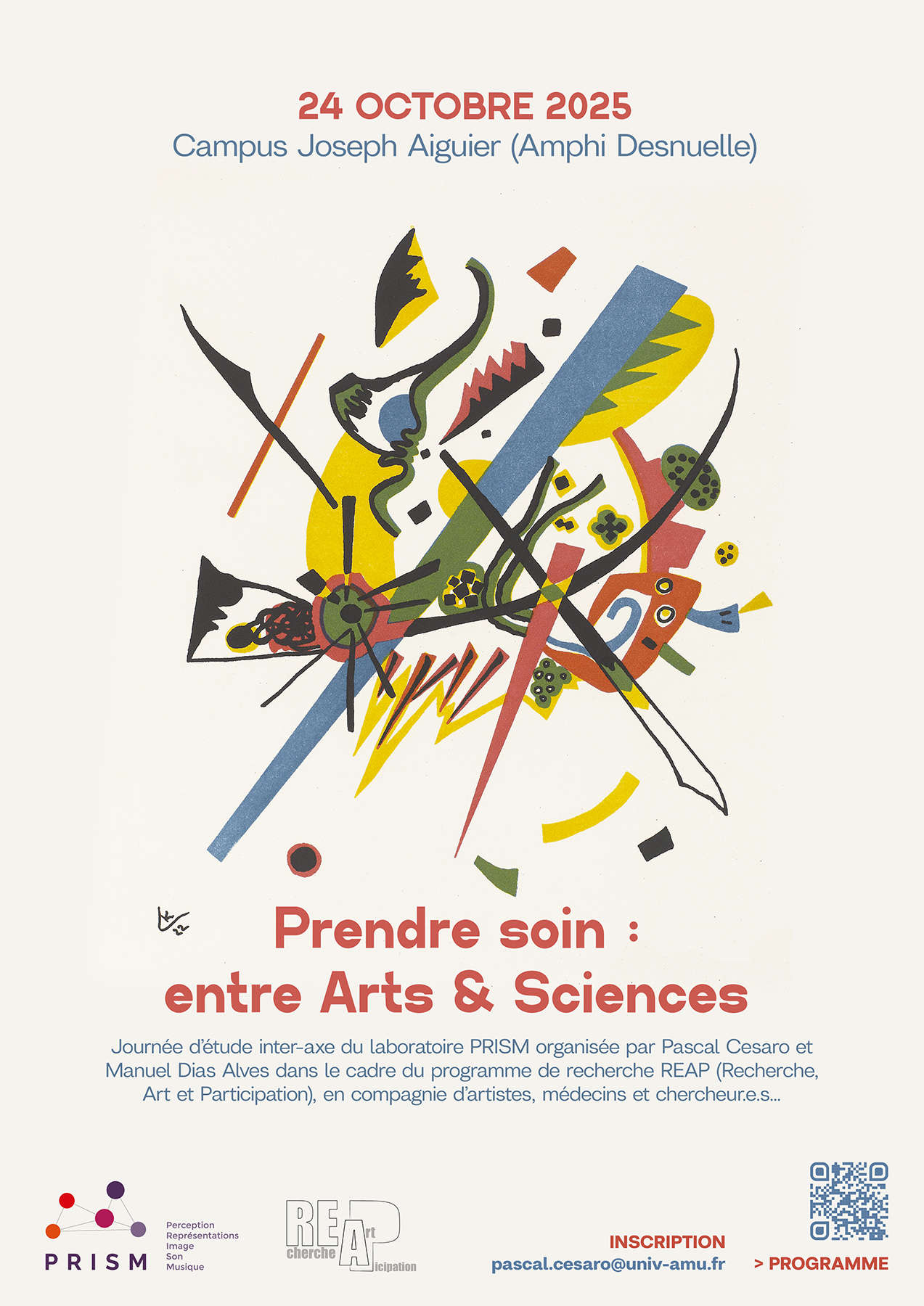 Cette journée d’étude inter-axe du laboratoire PRISM est organisée par Pascal Cesaro et Manuel Dias Alves dans le cadre du programme de recherche REAP (Recherche, Art et Participation) en compagnie d’artistes, de médecins et de chercheur.e.s qui interviennent à la croisée entre Arts, Sciences et Santé. Leurs présentations interrogent des formes d’actions singulières qui sont liées à l’acte de prendre soin avec l’objectif de dépasser l’idée de l’Art comme forme de divertissement et afin de redéfinir la valeur scientifique de la production artistique dans une dynamique thérapeutique.